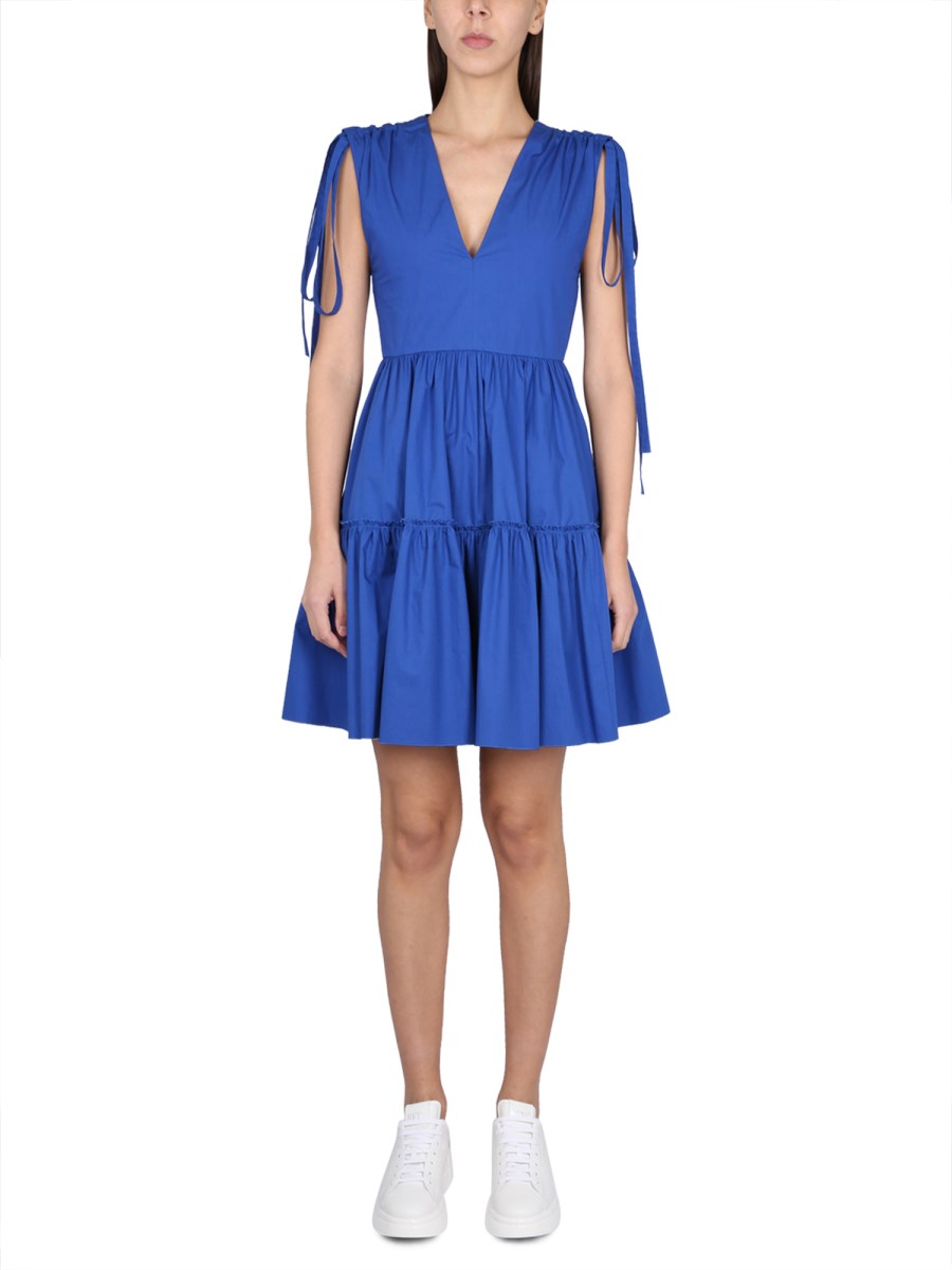 composizione- SCOLLO A V- CHIUSURA CON ZIP A SCOMPARSA SUL RETRO- FIOCCHI SULLE SPALLE- 100% POLIESTERE- MADE IN ITALY- LA MODELLA É ALTA 180 CM E INDOSSA LA TAGLIA 40 IT