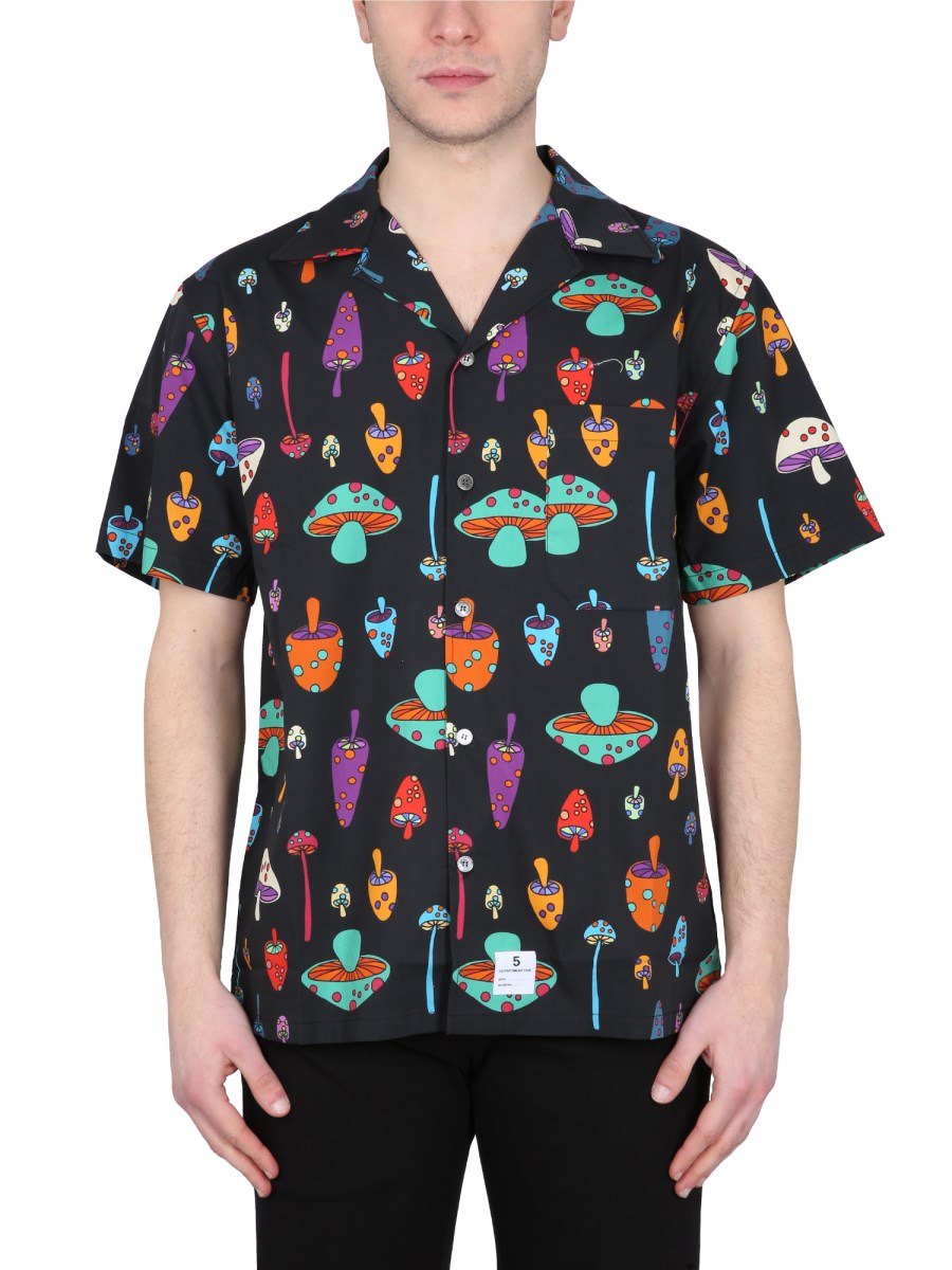 composizione- COLLETTO CAMICIA- CHIUSURA FRONTALE CON BOTTONI- TASCA LOGO APPLICATA AL PETTO- STAMPA MUSHROOM ALL OVER- 100% COTONE- IL MODELLO È ALTO 190 CM E INDOSSA LA TAGLIA 40