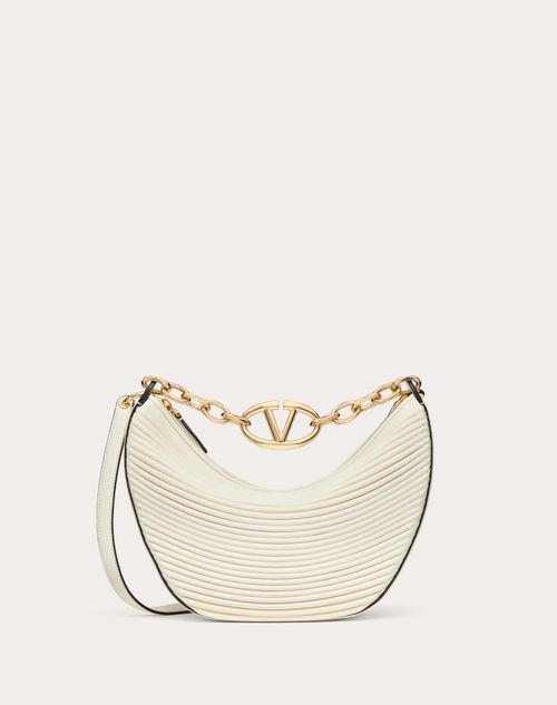 Hobo piccola Valentino Garavani VLogo Moon Bag con lavorazione di tubolari in nappa e catena dettagliata da elemento VLogo Signature metallico. La borsa può essere indossata a spalla/cross-body o a mano grazie alla catena ed alla tracolla in pelle amovibile.- Catena e parti metalliche finitura dorata- Tracolla in pelle regolabile e amovibile- Chiusura a zip- Fodera in nappa. Interno: una tasca piatta- Altezza (luce) tracolla: 55 cm- Altezza (luce) catena: 22 cm- Dimensioni: W29xH23xD11 cm- Made in Italy