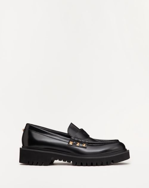 Mocassino Rockstud Valentino Garavani in vitello- Borchie finitura platino- Logo Valentino Garavani impresso sulla linguetta- Fondo carrarmato in gomma- Altezza tacco 50mm/2" con 25mm/1" plateau- Made in Italy