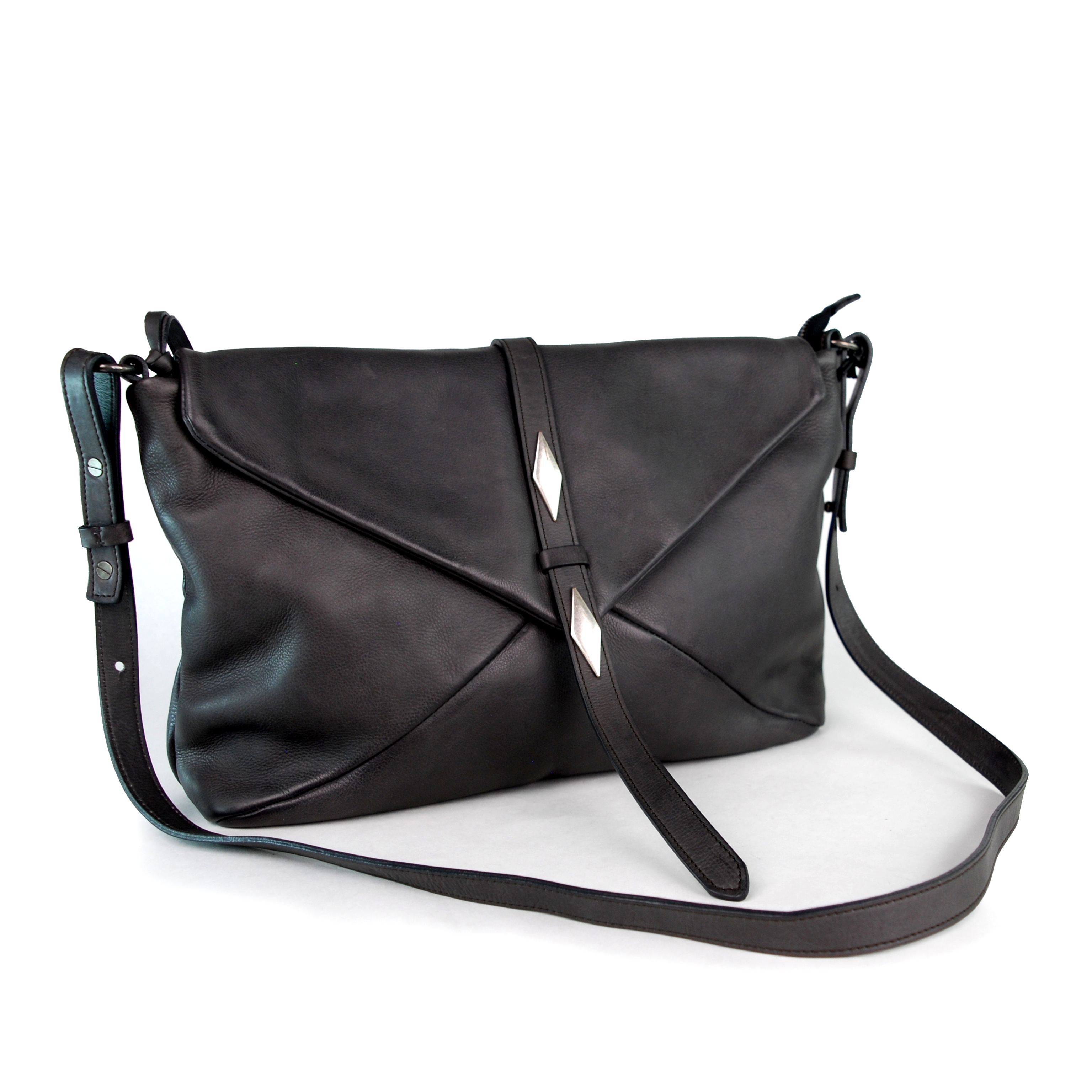 Ampia borsa con chiusura zip e patta in morbidissima pelle di vacchetta dal touch soffice.Fodera in cotone. Tasche interne multiuso, tracolla regolabile e removibile.